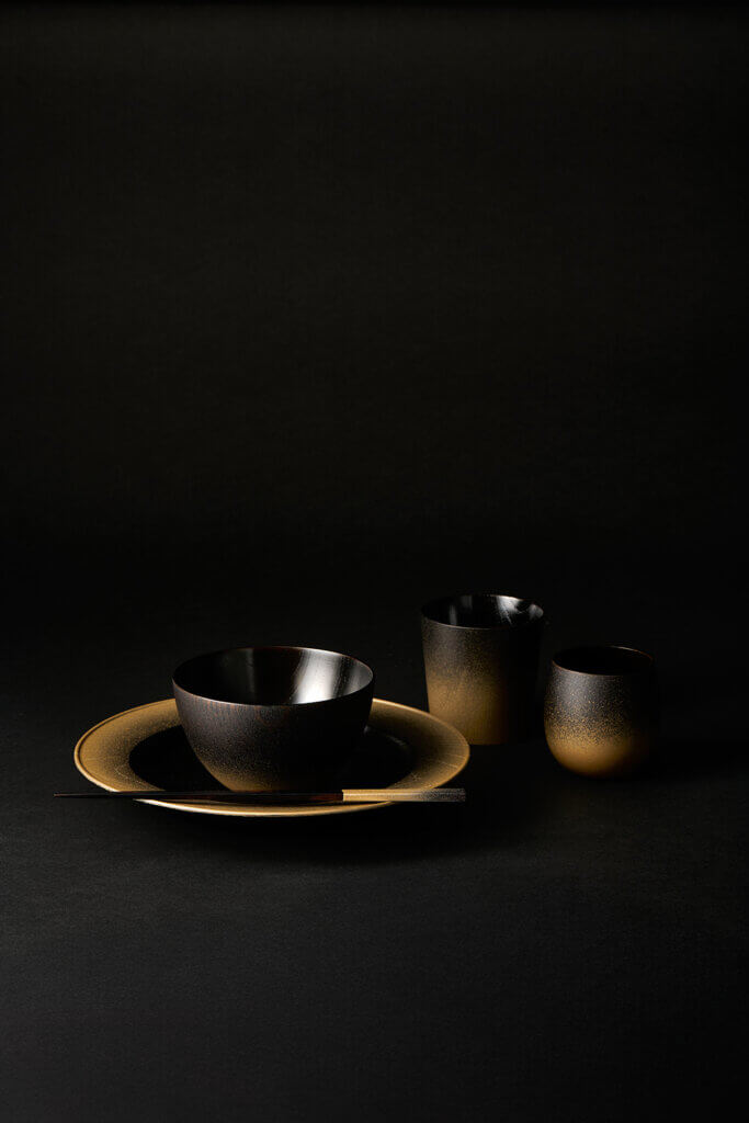 全体的には山中漆器の特徴の「拭き漆」で光沢を上げ、リムやカップ、ボウルの下部に金や銀でグラデーションに仕上げ、さらにクリア塗装を重ねることで漆の深みと金属的な輝き、そのコントラストも楽しめる仕上がりにこだわっています。